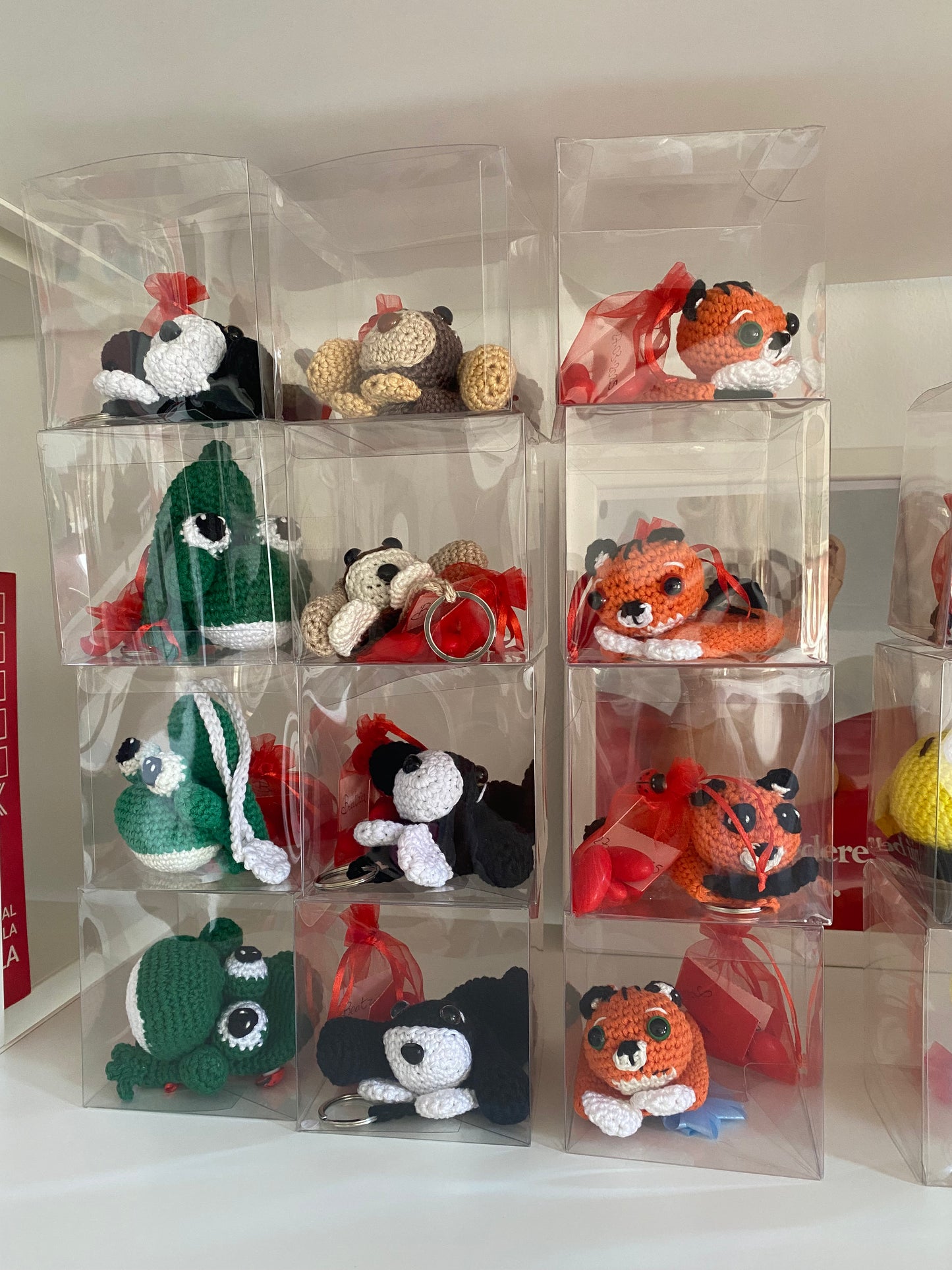 Pupazzetti realizzato all'uncinetto con la tecnica Amigurumi. Puoi scegliere tra due tipologie di portachiavi: l'animaletto con sacchetta o senza, con il laccetto e l'anello portachiavi cucito direttamente sulla testolina.