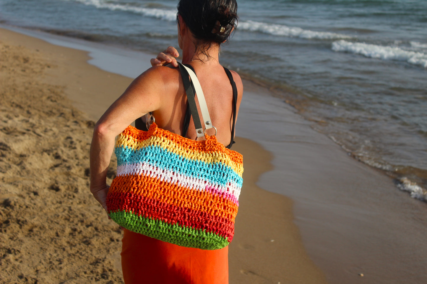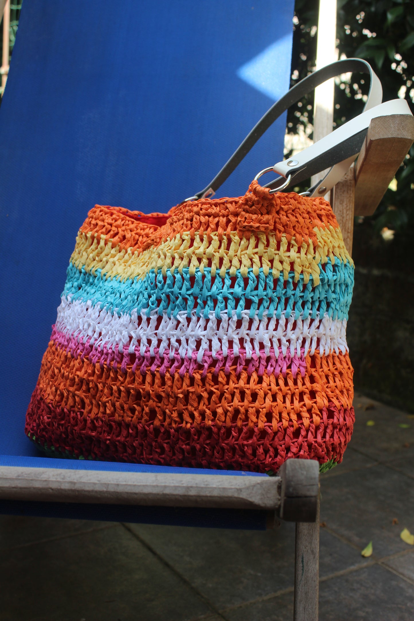 Interamente realizzata a mano ad uncinetto con filato di rafia naturale. Foderata con tessuto 100% cotone, con doppio taschino. Chiusura con bottone automatico. Portabilità a braccio e a spalla. Molto leggera e capiente.