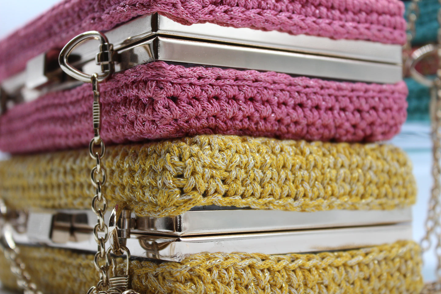 Interamente realizzata a mano. Clutch trasparente rivestita con filato Thai Lurex. Le varianti rosso e nero sono realizzate in filato Thai Sublime. Chiusura a scatto e cerniere in oro. Catena in oro. Piccolo gioiellino da sfoggiare non solo per un’occasione speciale ma anche per dare un tocco scintillante ad un abbigliamento casual