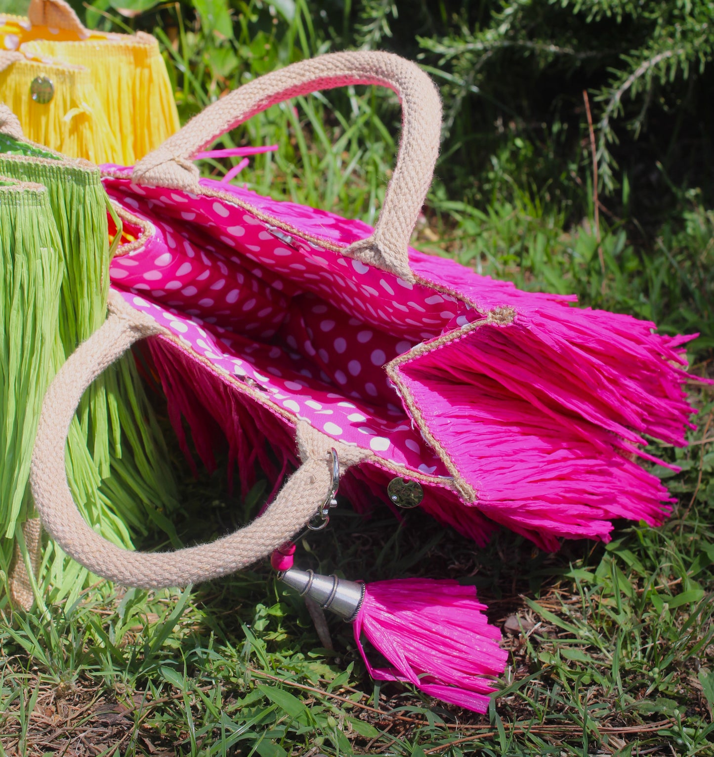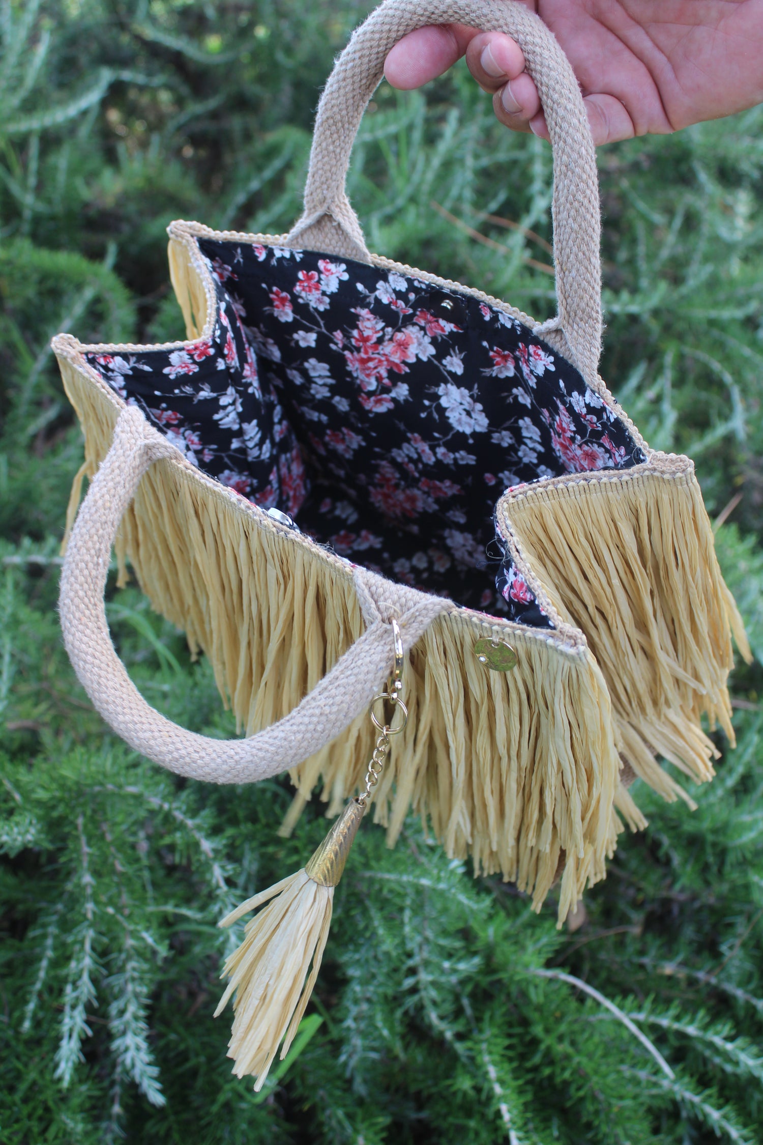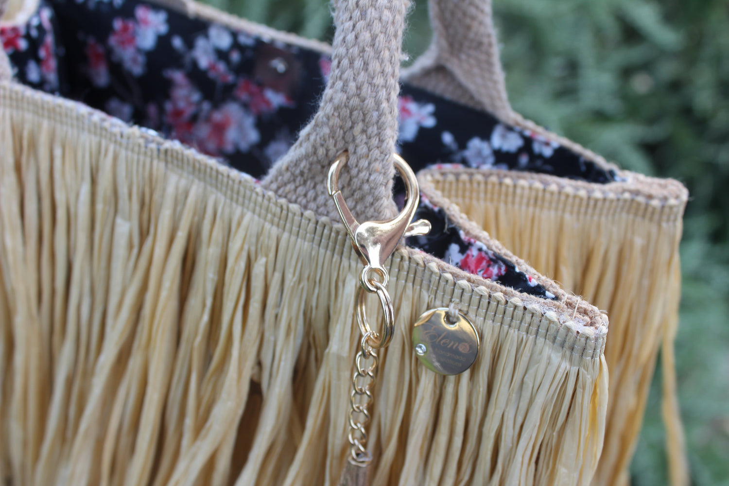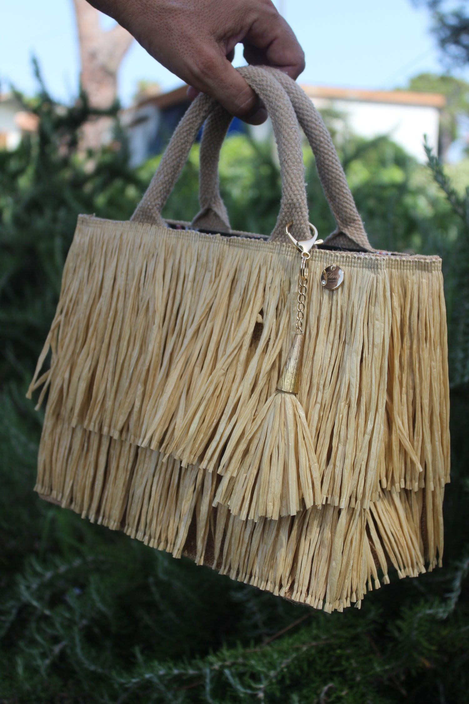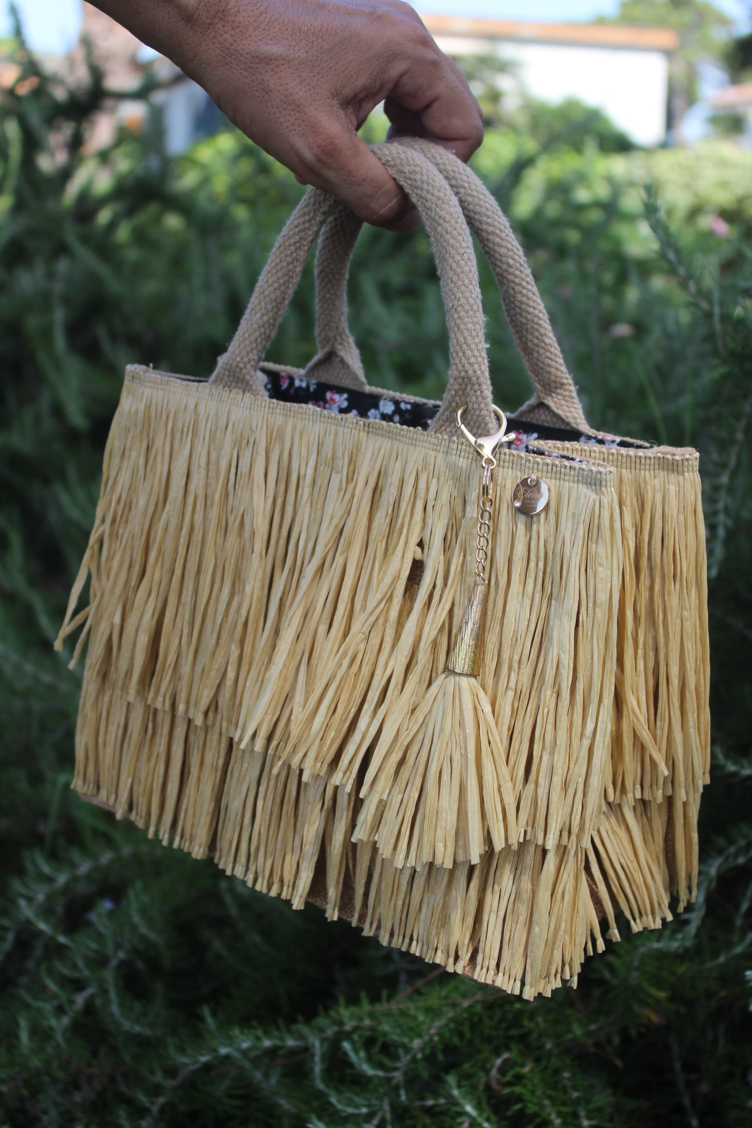 La preforma in juta è stata foderata in tessuto di cotone e contornata da una doppia bordura di frange in rafia. Chiusura con bottone automatico. Portabilità a braccio.