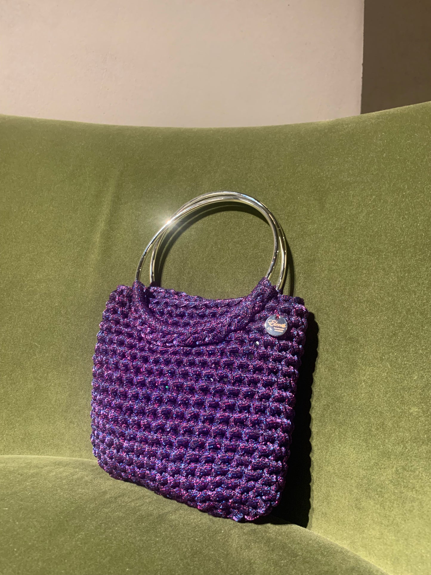 Interamente realizzata a mano in fettuccia di cotone elastico. Doppio manico per impugnatura a mano e tracolla opzionale per una portabilità a spalla.