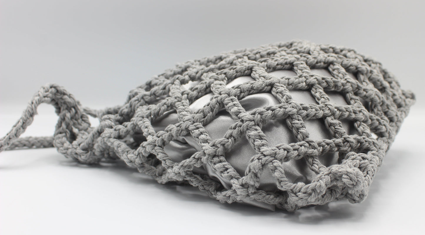 Interamente realizzata a mano in morbido cordino di cotone lavorato a rete e dotata di sacchetta interna in raso in tinta. Chiusura con laccetto. Portabilità a spalla e a mano.
