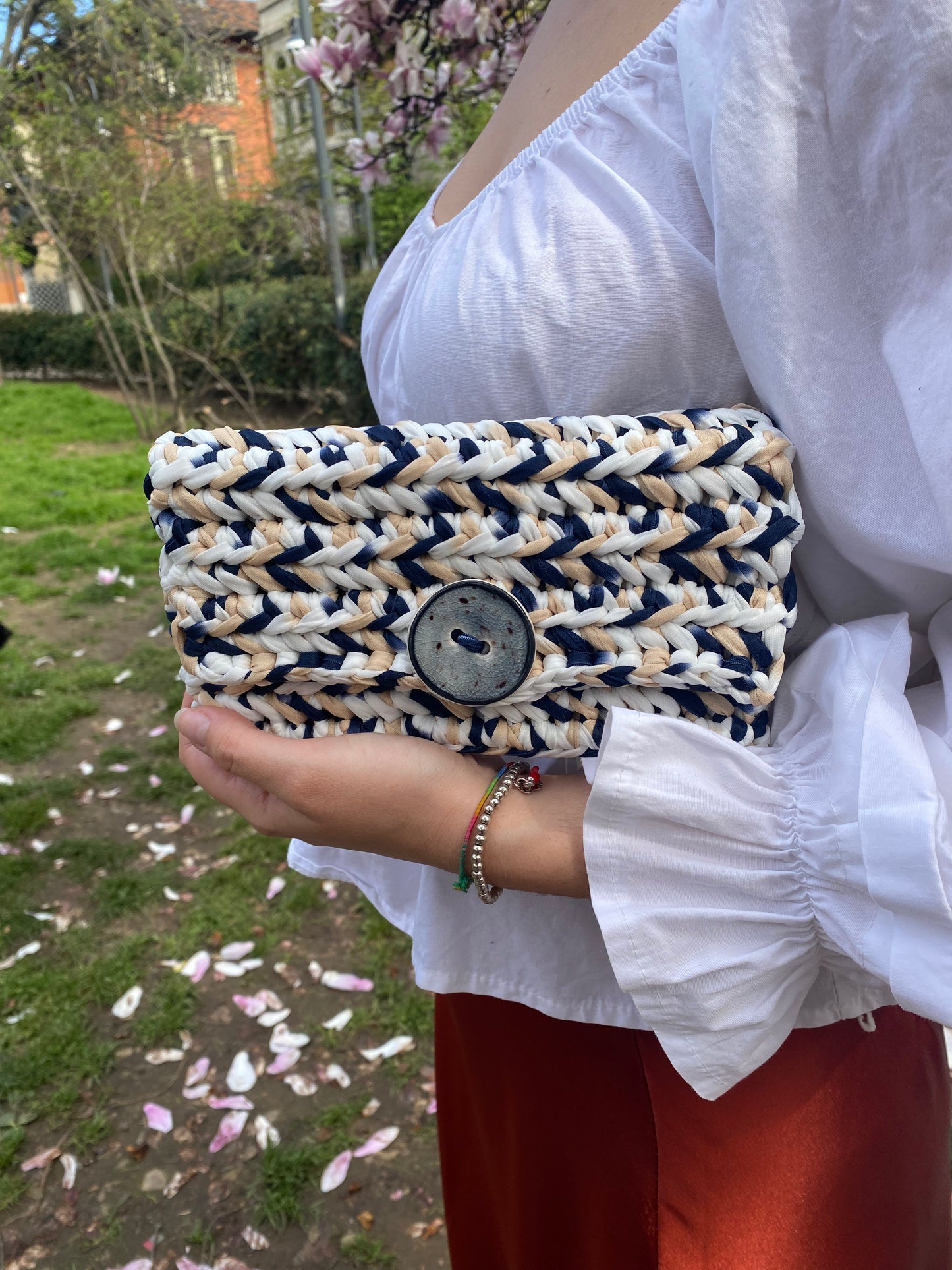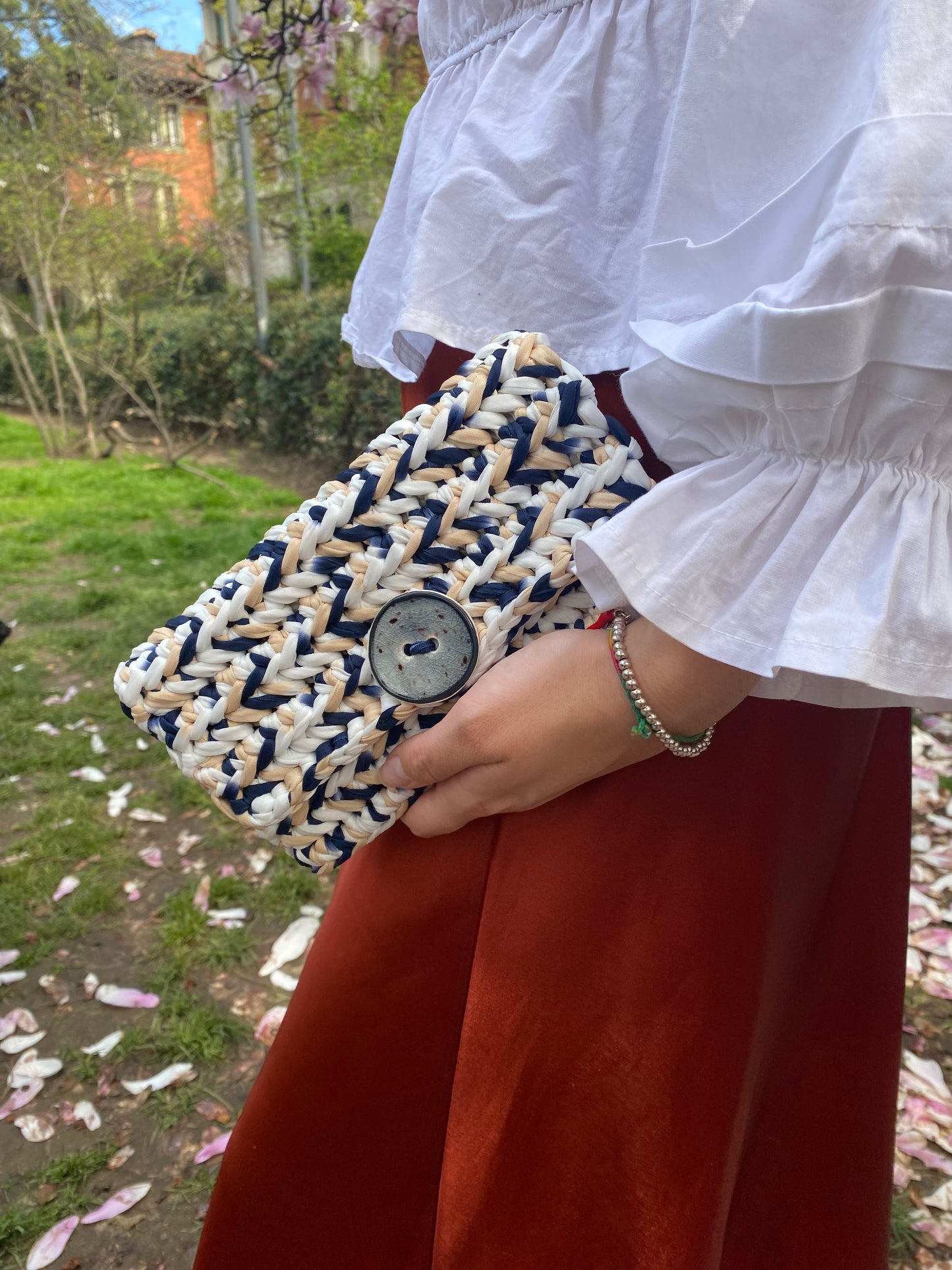 Interamente realizzata a mano in fettuccia di lycra.. Chiusura con bottone medio-grande. Tracolla cm 60 in metallo antigraffio. Piccola e leggera, ma capiente quanto basta per contenere un portacarte, un cellulare e un mazzo di chiavi
