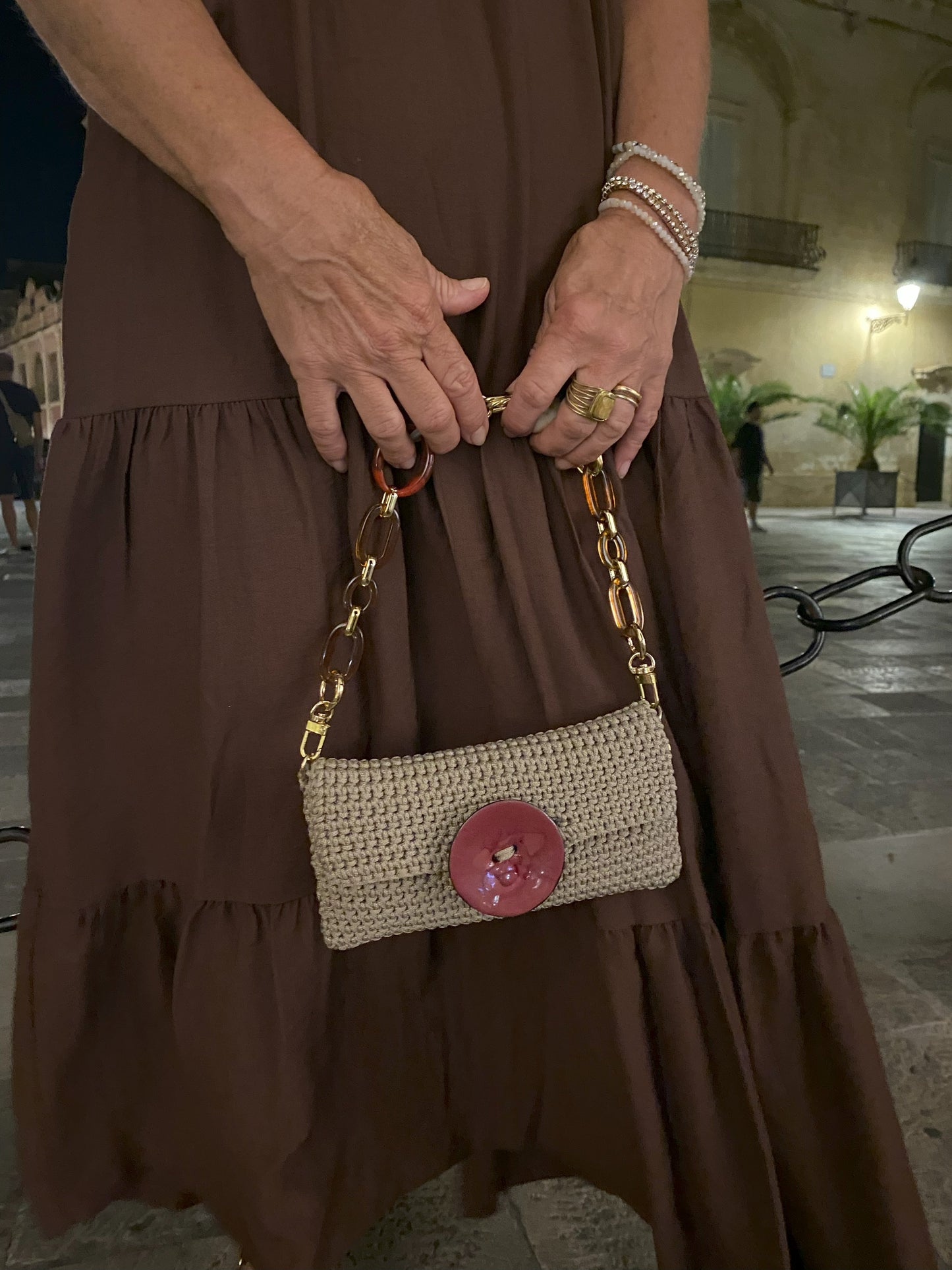 Interamente realizzata a mano in cordino Thai 100% made in Italy. Chiusura con bottone gigante. Tracolla cm 60 in metallo antigraffio. Piccola e leggera, ma capiente quanto basta per contenere un piccolo portafoglio, un cellulare e un mazzo di chiavi