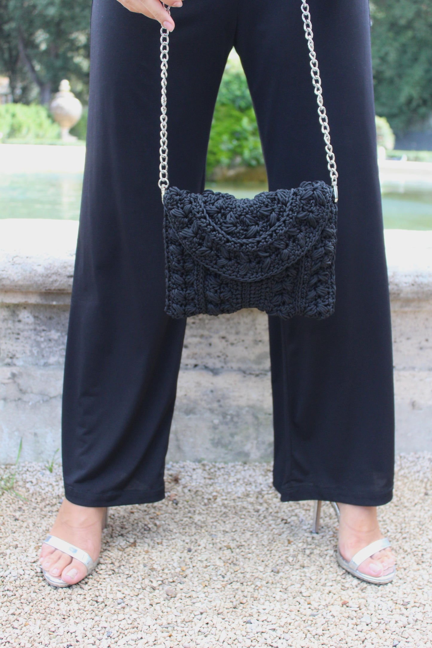 Un'elegante pochette interamente realizzata a mano in cordino Thai 100% made in Italy. Foderata in tessuto di cotone 100%. Chiusura con automatico. Tracolla cm 100 in metallo antigraffio. Piccola e leggera, ma capiente quanto basta per contenere un piccolo portafoglio, un cellulare e un mazzo di chiavi