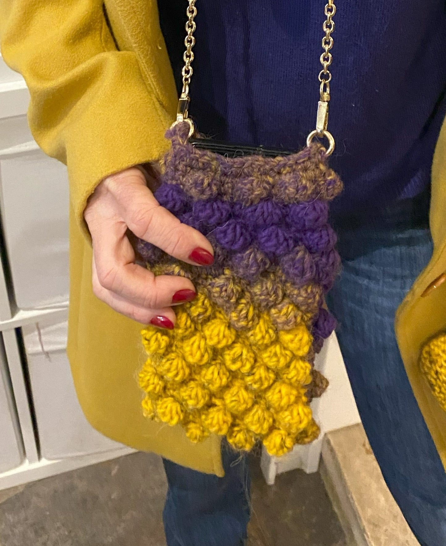 Interamente realizzato a mano in filato di lana acrilica made in Italy. Tracolla cm 90 in metallo antigraffio oro con moschettoni, amovibile. Pensato come portacellulare, può diventare quello che vogliamo: una piccola pochette porta-cose, dalle chiavi agli occhiali da sole.